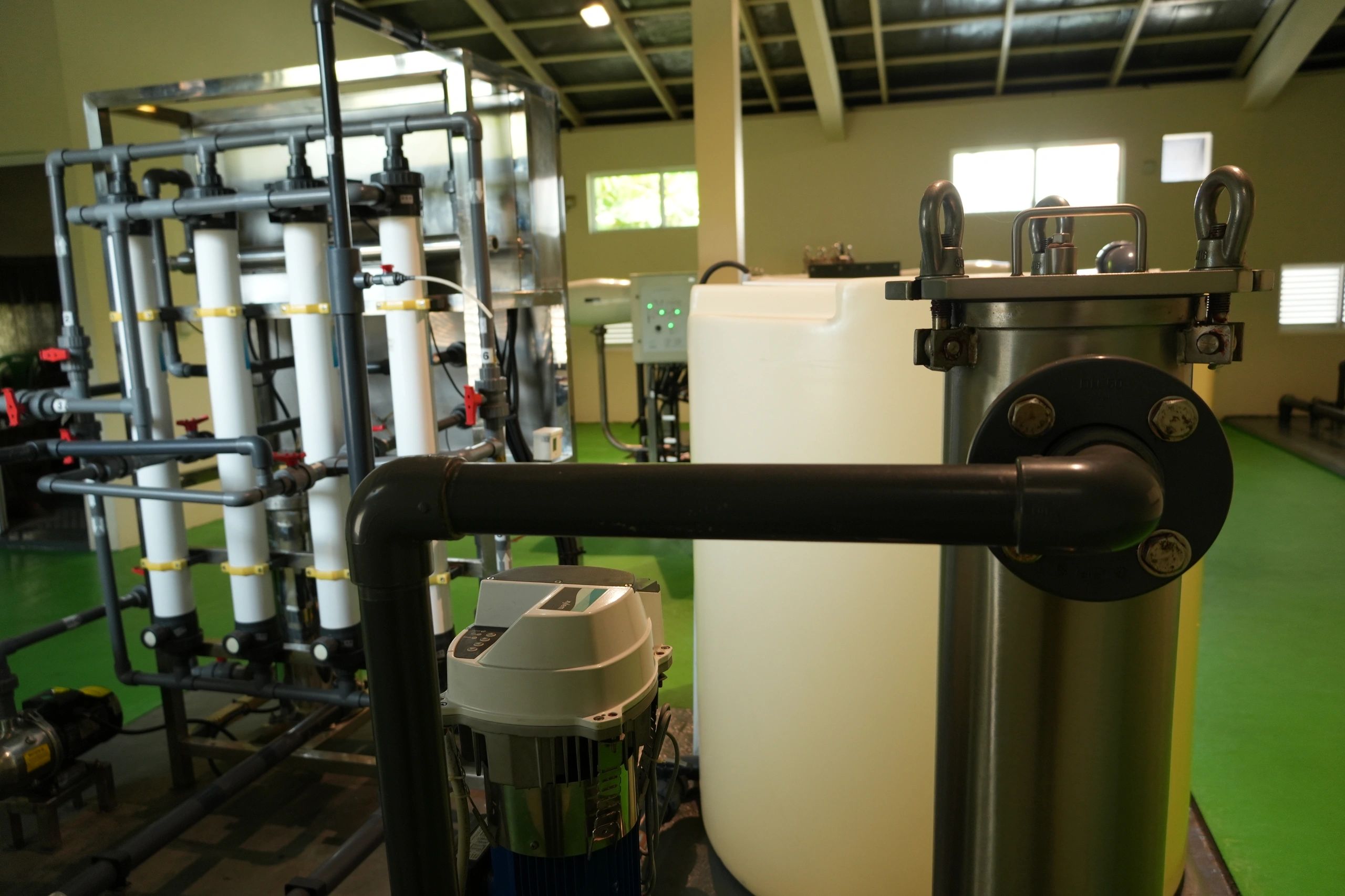 Industrial water processing system with tanks, filtration units, and piping